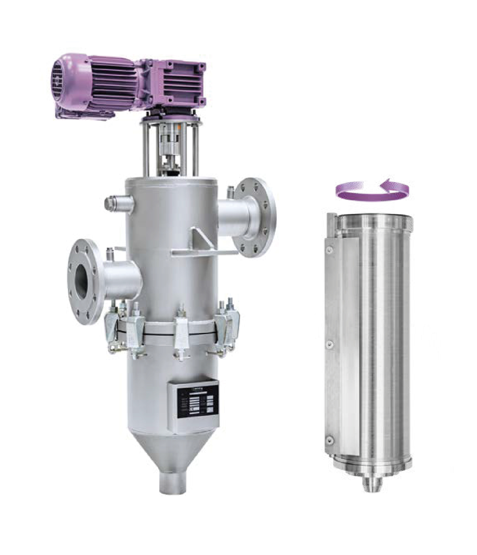 Czyszczenie przebiega w następujący sposób: Silnik przekładniowy obraca cylindryczny element filtrujący, do którego przymocowany jest skrobak. Skrobak usuwa cząstki stałe z powierzchni. Zanieczyszczenia osadzają się na dnie obudowy filtra. Po otwarciu zaworu kulowego/wylotu, cząstki stałe są odprowadzane pod wpływem ciśnienia roboczego wewnątrz obudowy.