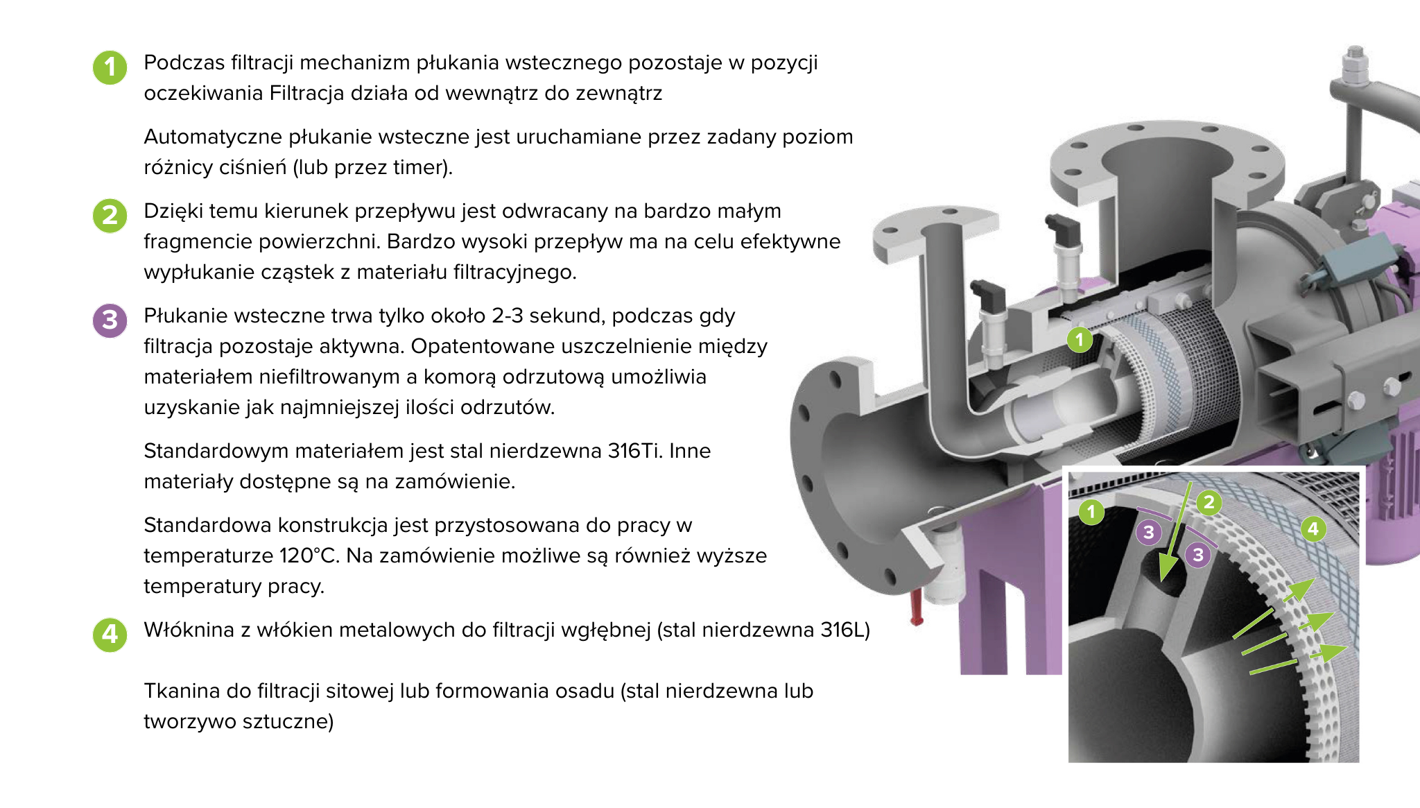 Zapewnia niezawodną filtrację wsteczną, zapewniającą najdokładniejszą filtrację płynów w przemyśle i uzdatnianiu wody. Opatentowany system płukania wstecznego zapewnia najwyższą ciągłość procesu przy najniższych ilościach płukania wstecznego.