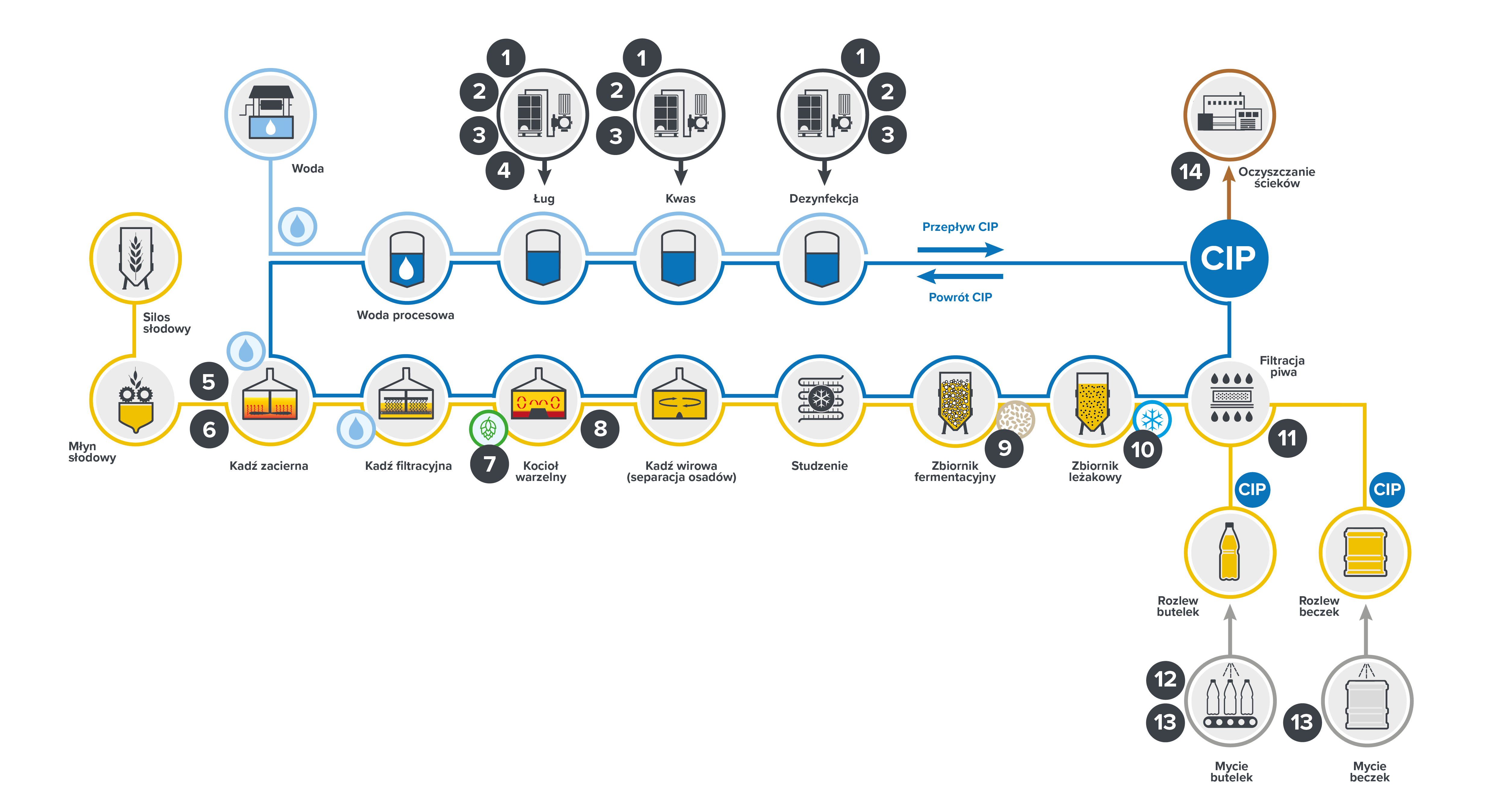 Instalacje i systemy do produkcji żywności i napojów muszą być regularnie czyszczone i dezynfekowane - dotyczy to również warzenia piwa. Aby produkować wysokiej jakości piwo, oprócz zaawansowanych procesów warzenia, wymagane są ścisłe standardy higieny i wydajne procesy czyszczenia i dezynfekcji zakładów produkcyjnych, a także uzdatniania wszystkich zasobów wodnych wymaganych w procesie warzenia piwa. Niezawodna czystość wszystkich komponentów ma kluczowe znaczenie dla zapewnienia jakości i bezpieczeństwa produktu końcowego.